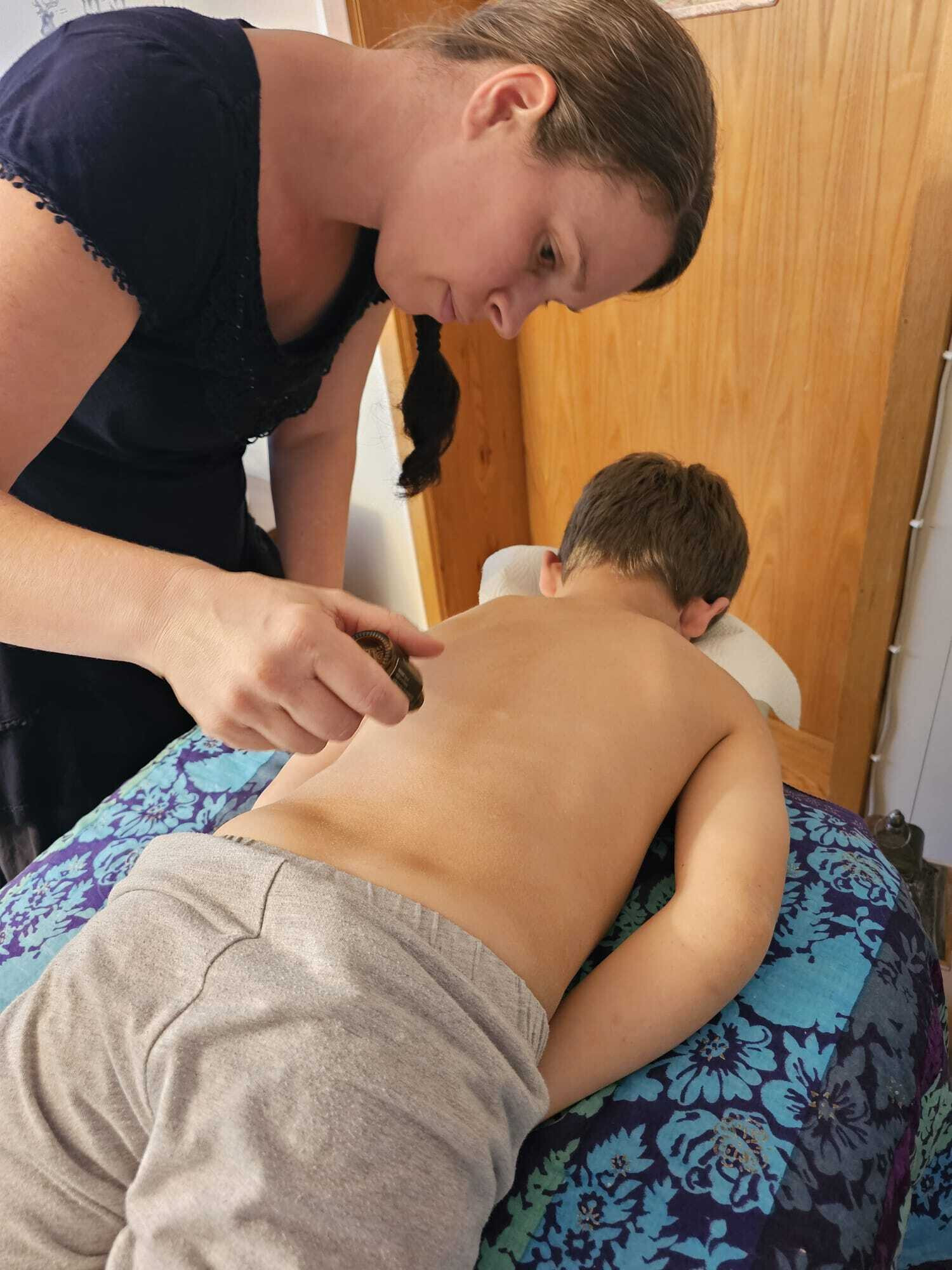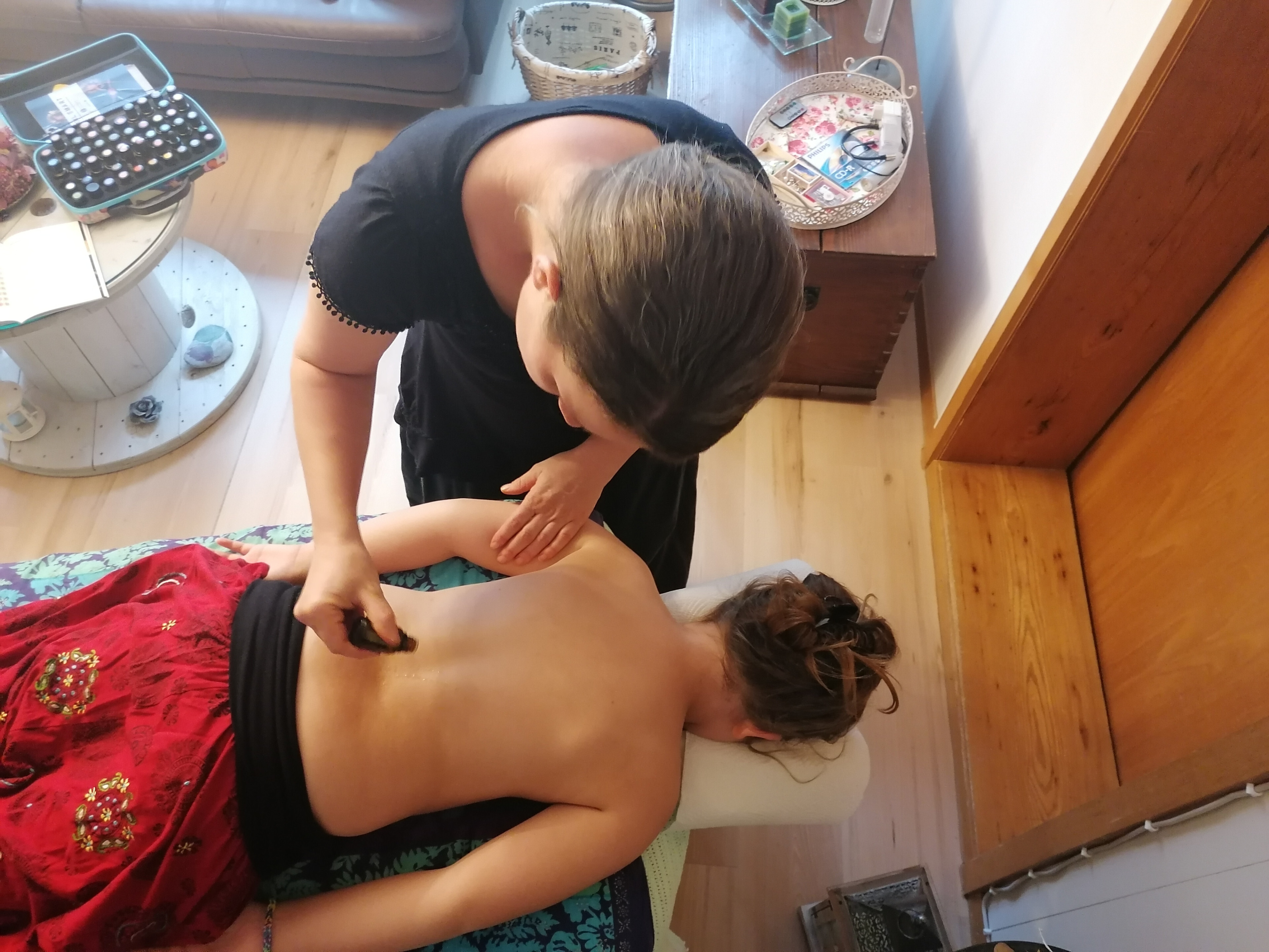 Die Anwendung erfolgt durch sanftes Auftragen ausgewählter ätherischer Öle entlang der Wirbelsäule und auf den Fußsohlen. Dabei entsteht eine tiefe Entspannung, während die Öle über die Haut aufgenommen werden und ihre wohltuende Wirkung entfalten können.